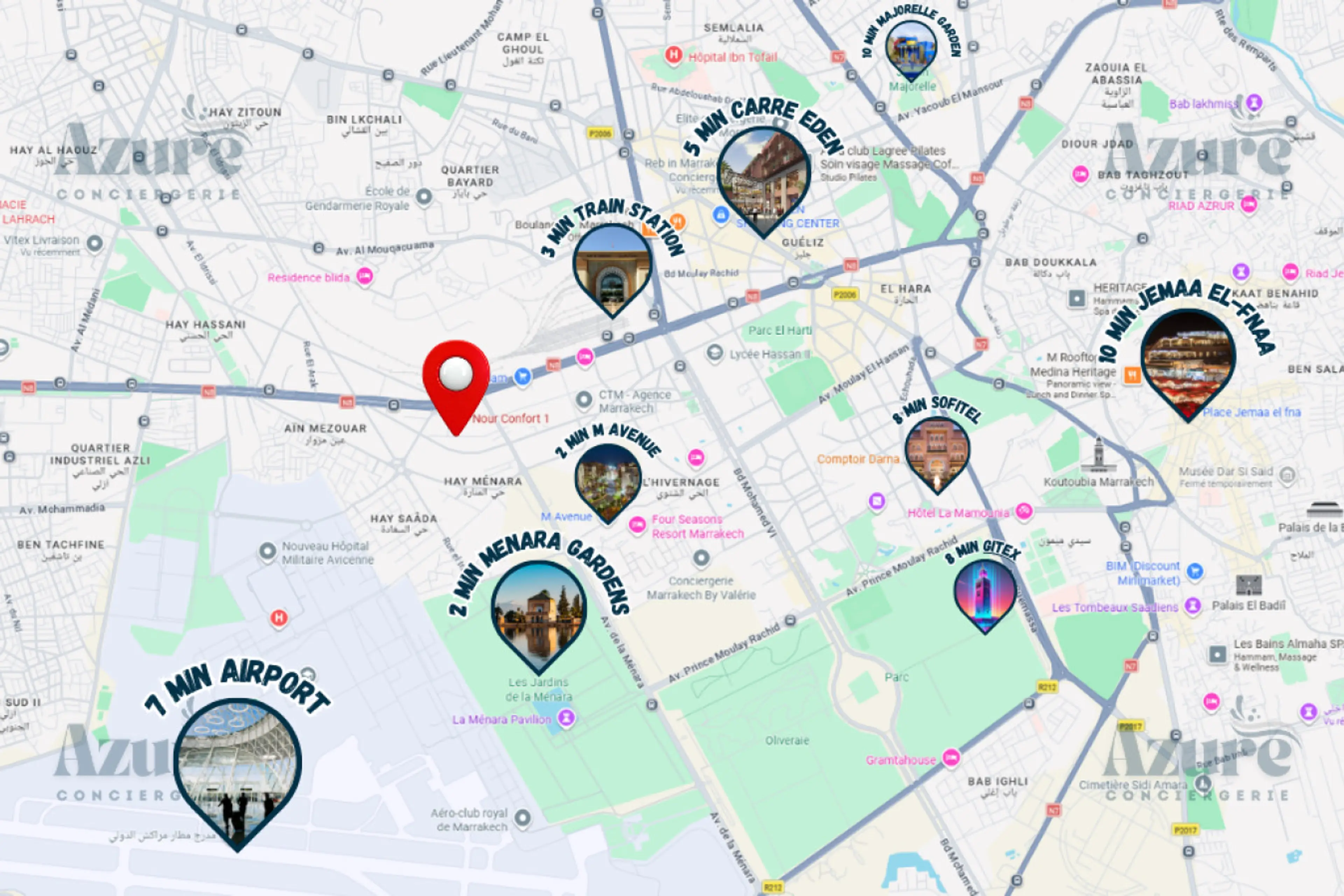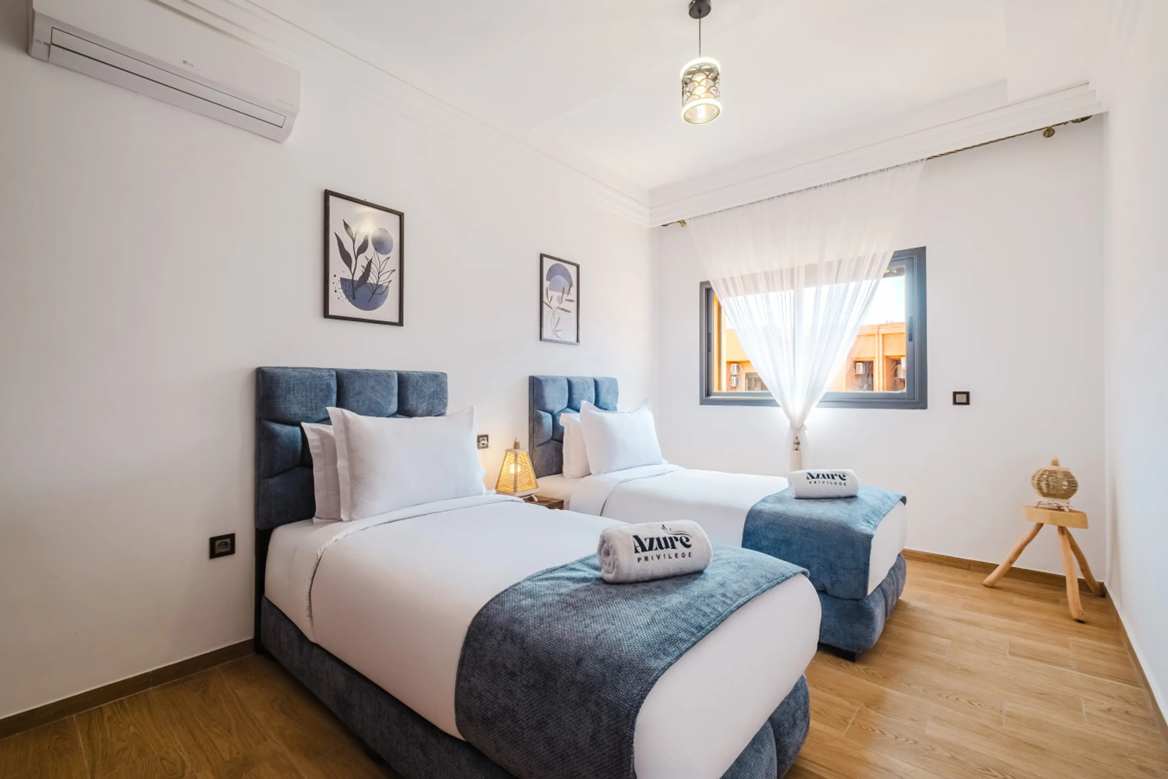 Bienvenue dans votre pied-à-terre à Marrakech ! Cet élégant appartement de 2 chambres situé dans la résidence sécurisée Nour Confort peut accueillir confortablement jusqu’à 6 voyageurs. Profitez d’un séjour alliant modernité, tranquillité et emplacement central, à seulement quelques minutes de M Ave...